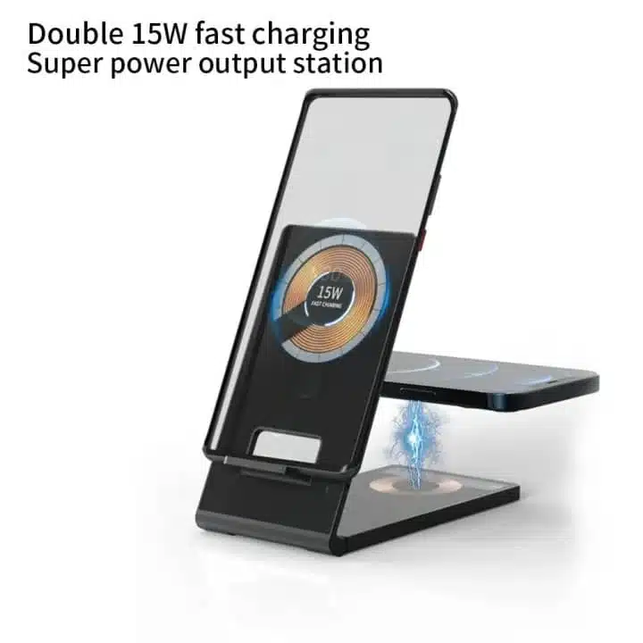 Simplify your charging routine with the 4 in 1 Wireless Charger — an all-in-one solution to power multiple devices at once. This sleek and compact wireless charging station is designed to charge your smartphone, smartwatch, AirPods, and an additional device simultaneously, eliminating cable clutter and saving space on your desk or nightstand.